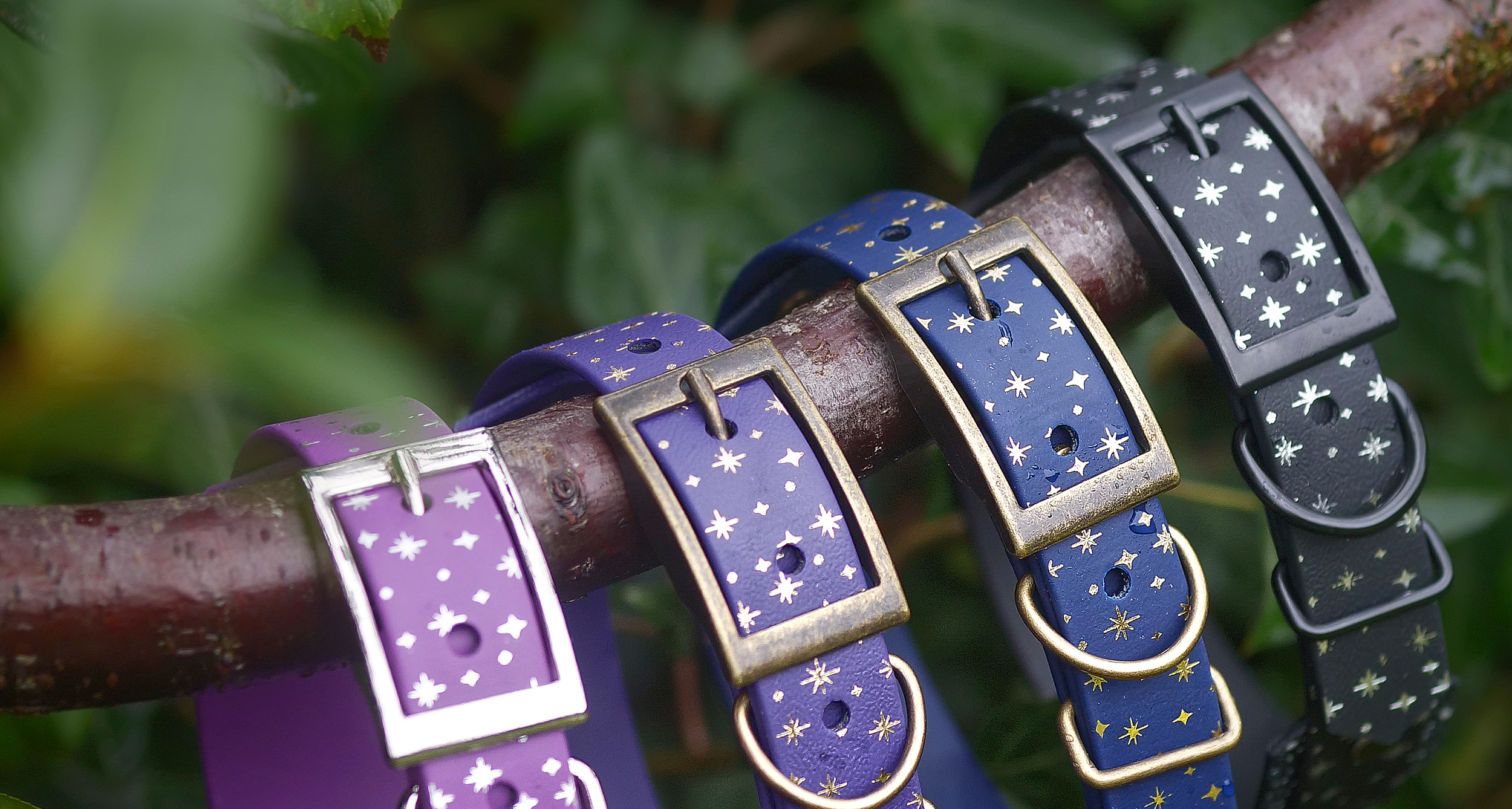 We have forest with lilac speckle stars and a lilac name plate. It’s STUNNING. The collar is so well made, with attention to each detail. The biothane wipes clean so easily and holds up so well with my spaniel!