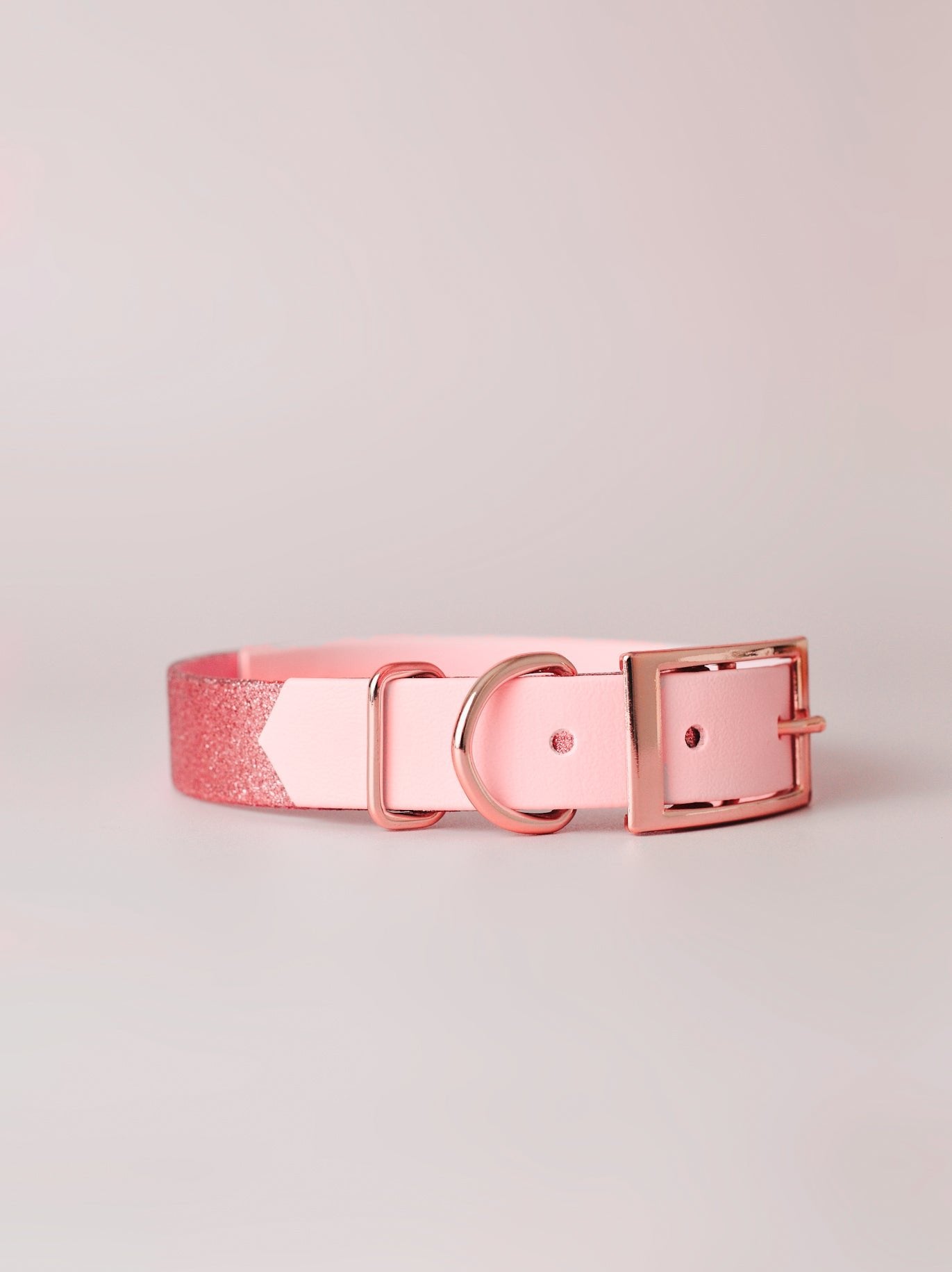 Made from authentic Pixie & Sakura Biothane and handpainted with our Rose Quartz glitter in our signature arrow style, our custom two-colour adjustable dog collars are: