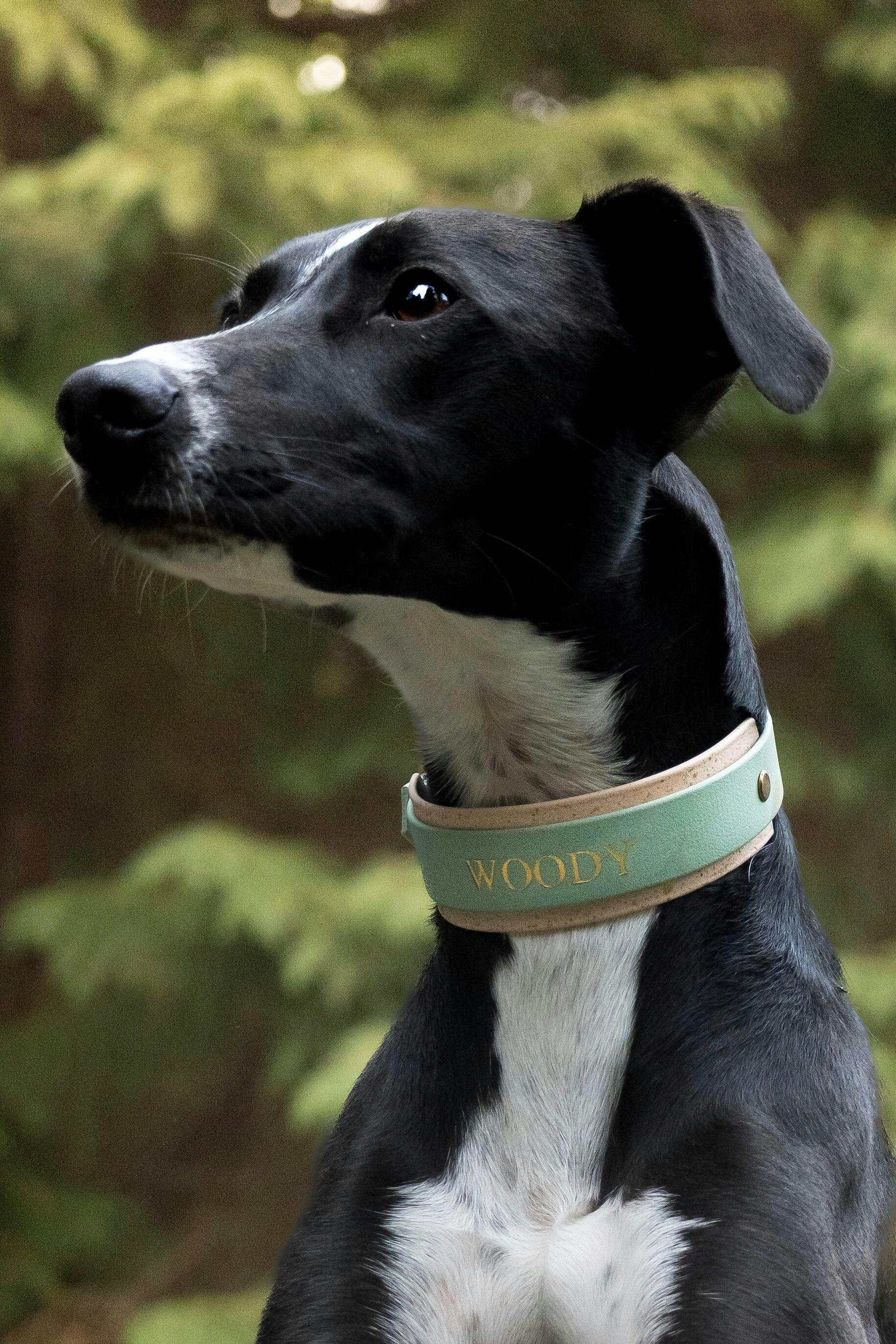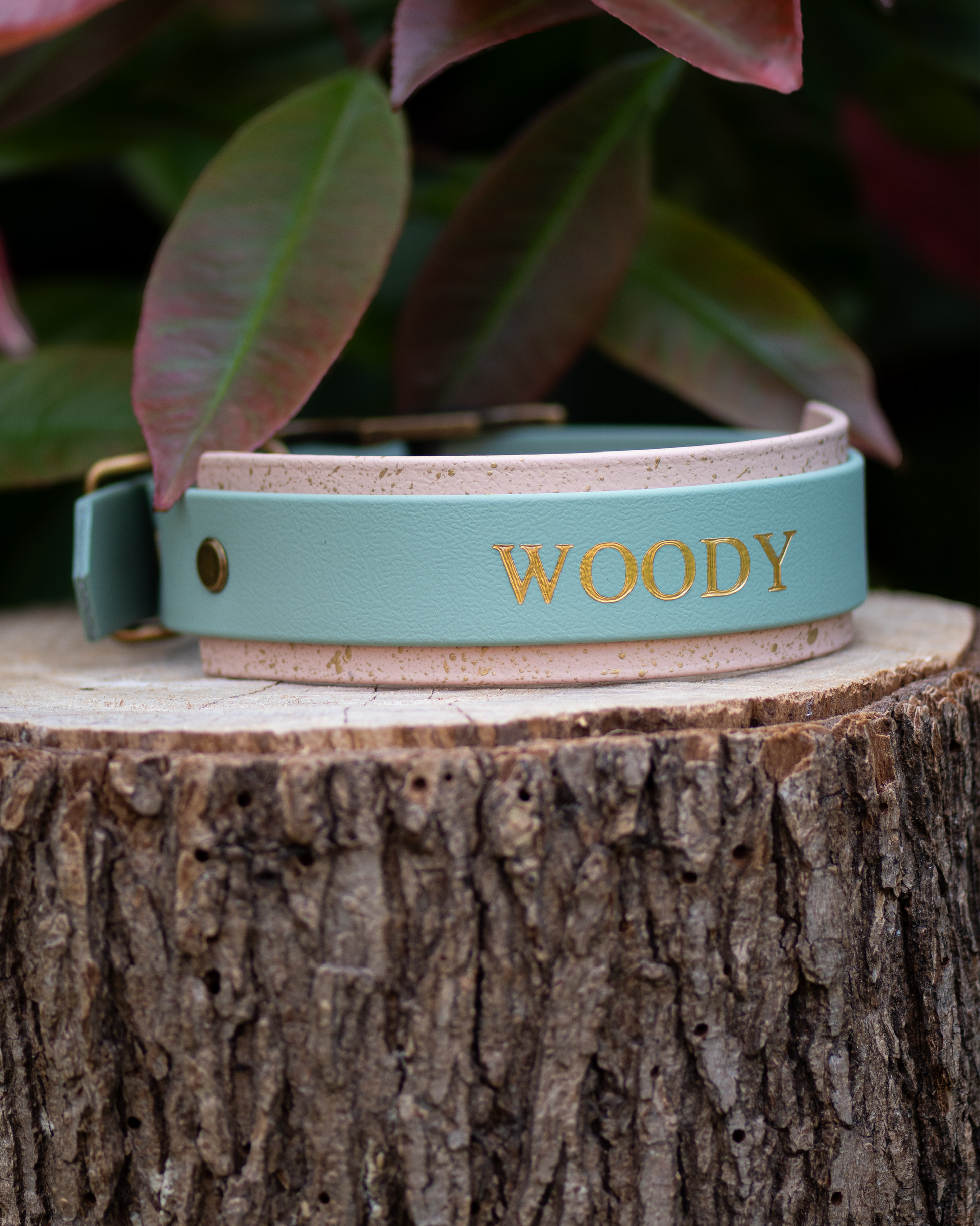 Featuring stunning matt gold embossed name details on a Sage Biothane wraparound with a Gold SS Champagne Backing. Birch is a classic, elegant addition to any dogs wardrobe.