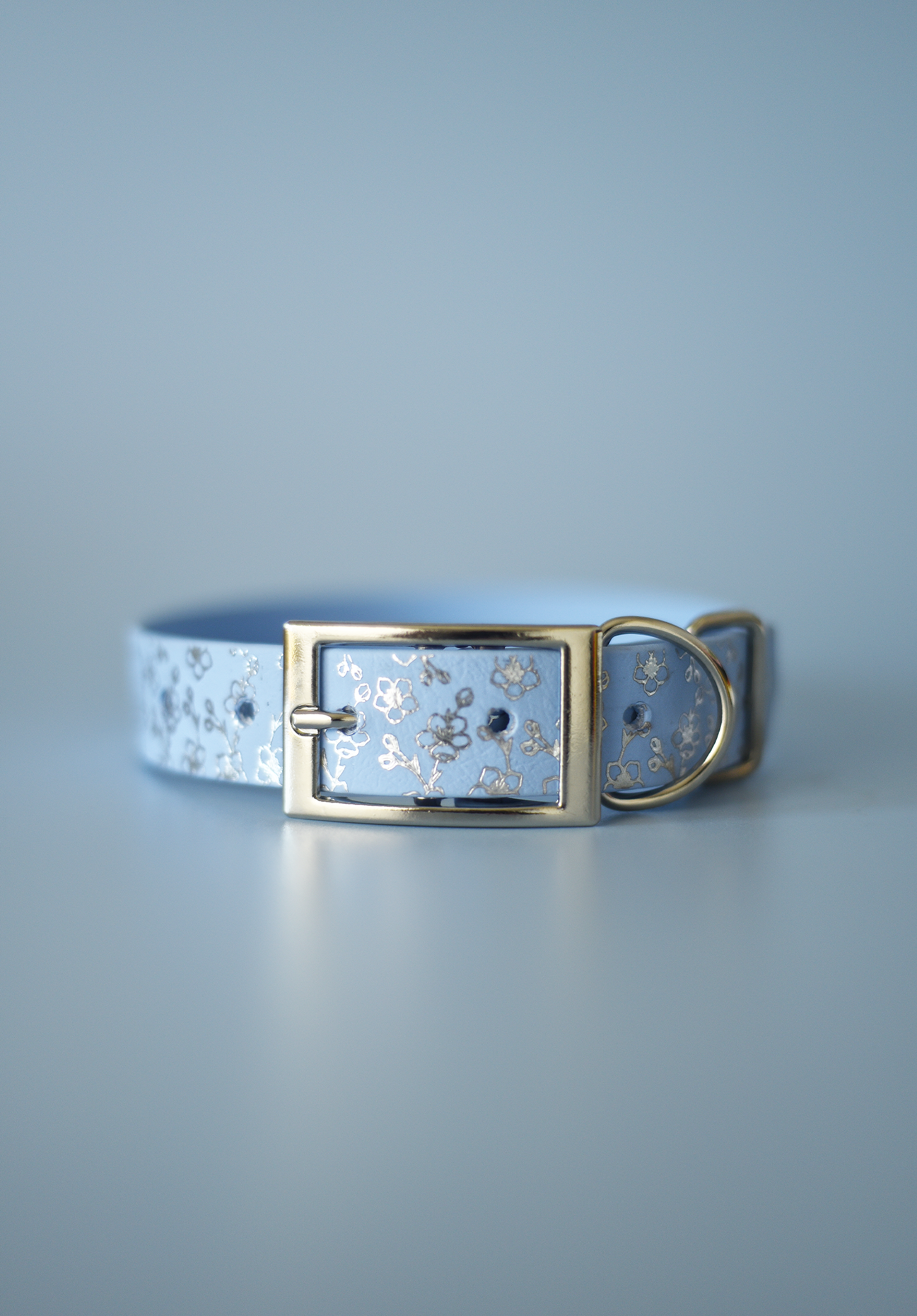 Our gorgeous Blossom collars are silver foil embossed with a stunning cherry blossom design onto our Polar Ice Biothane.
