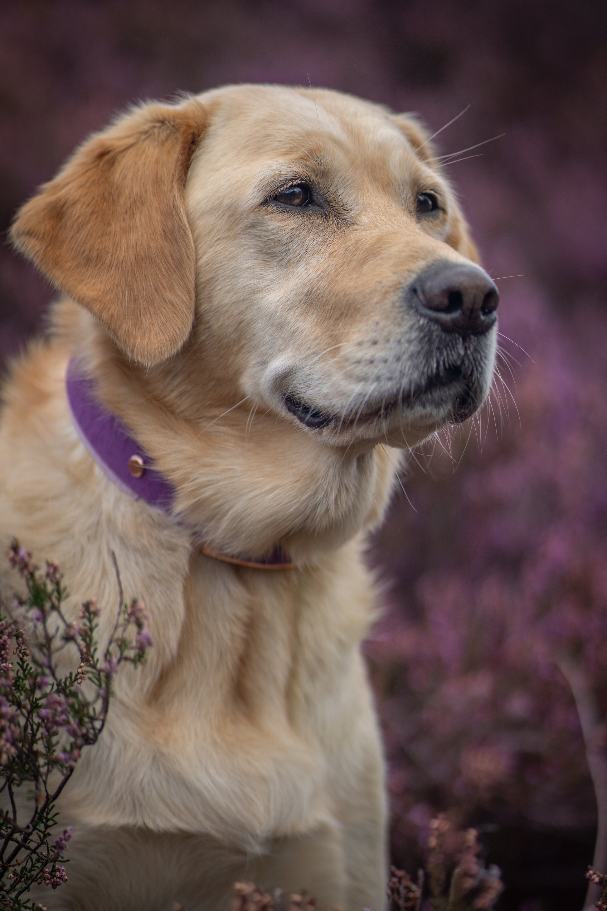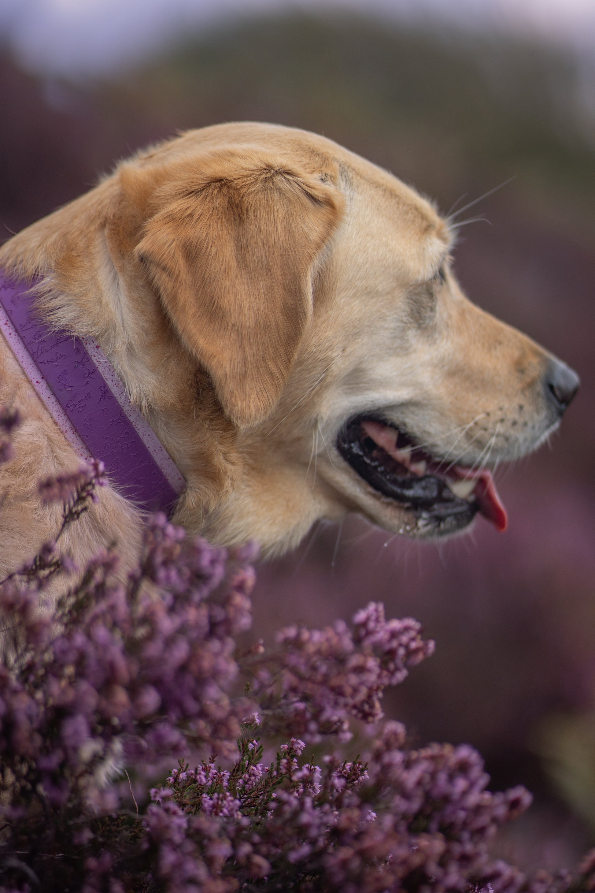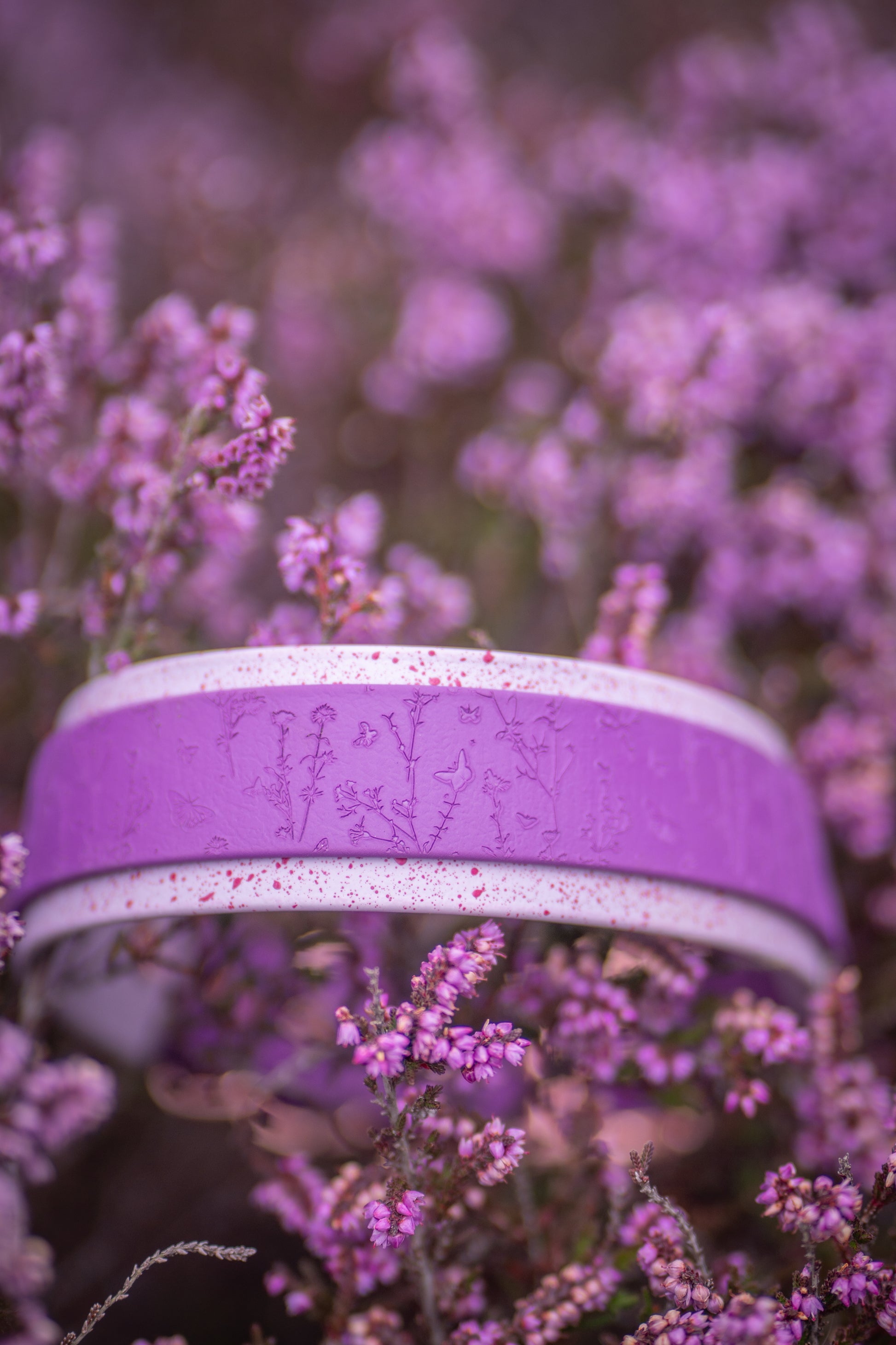 Made from authentic Fig and Lilac Biothane with Handpainted Magenta Speckled Stars, our “Butterfly Thicket” dog collar is: