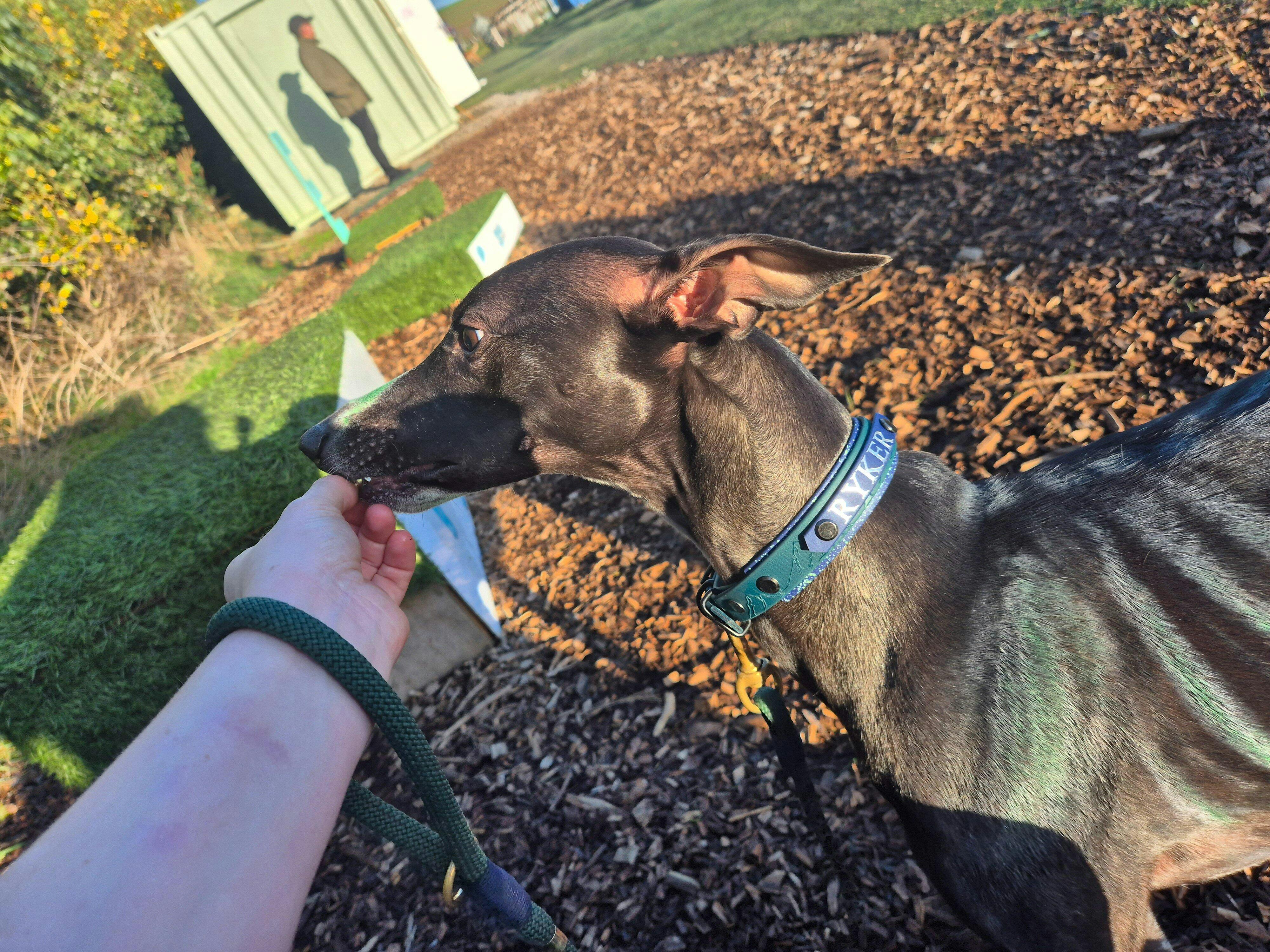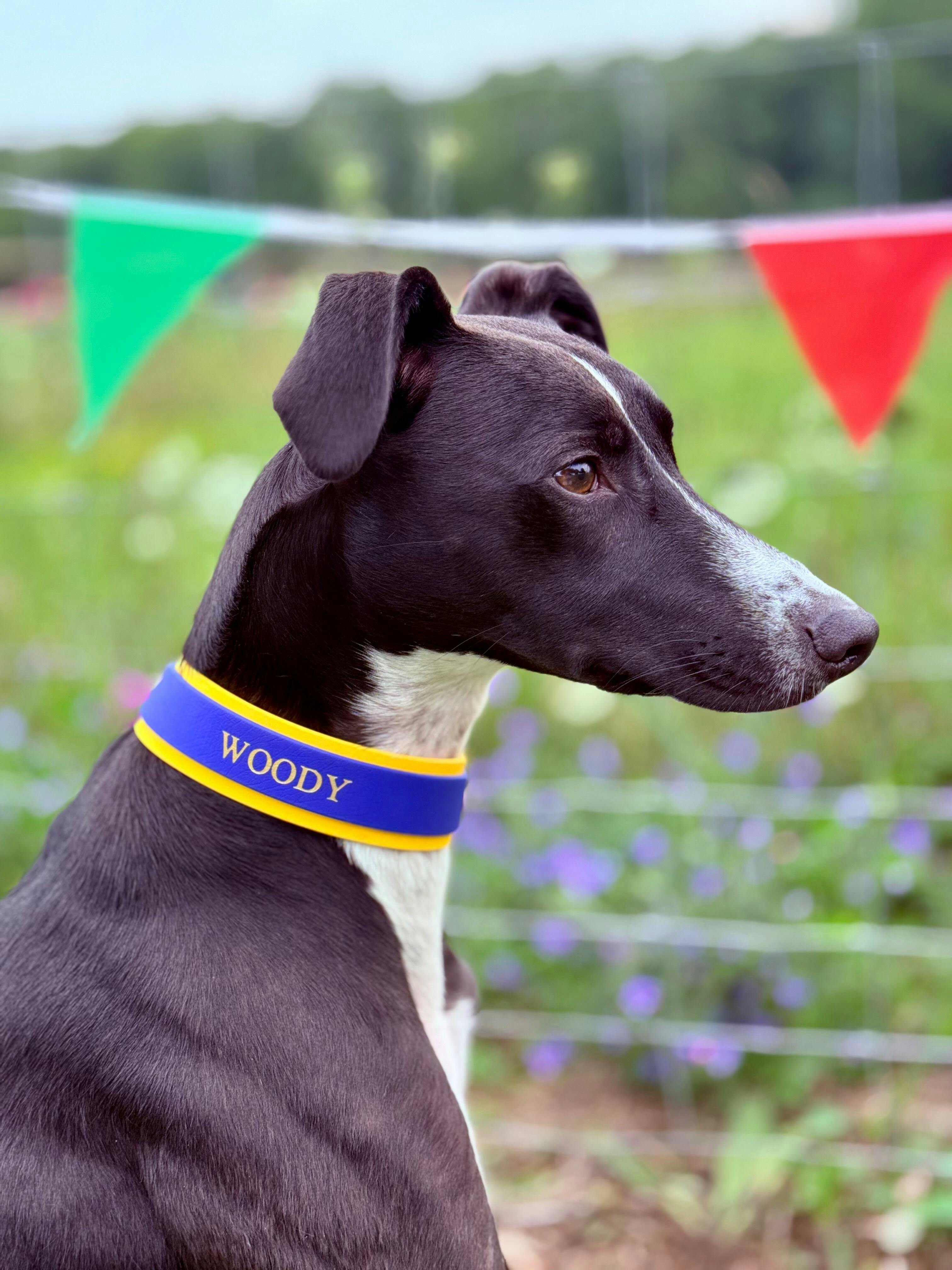 Odins collar is Moss X Guacamole with the Spellbound pattern in a size Large, we added a name plate too to finish off the design