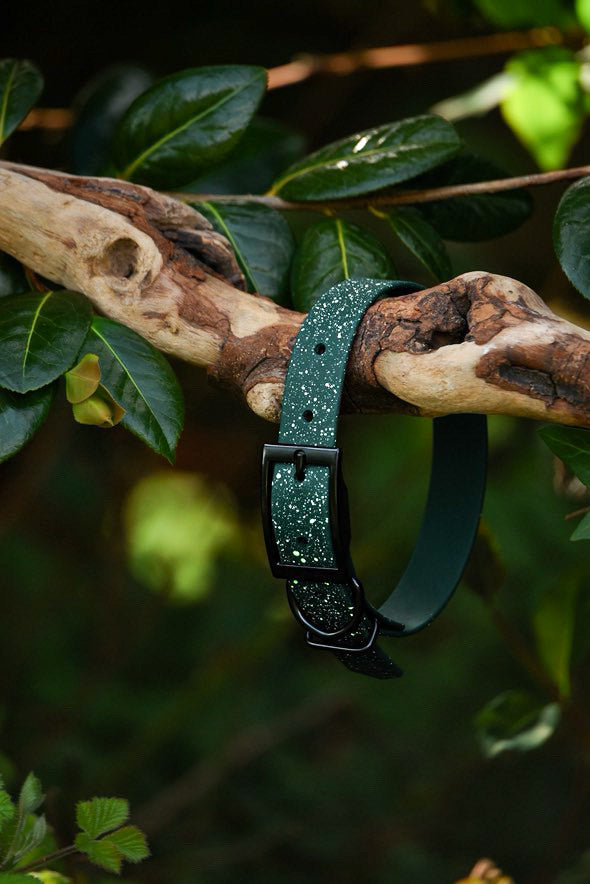 Part of our Speckled Star range, our Evergreen Grove collar is crafted from Violets authentic Biothane webbing, and handpainted with spring fields stars.