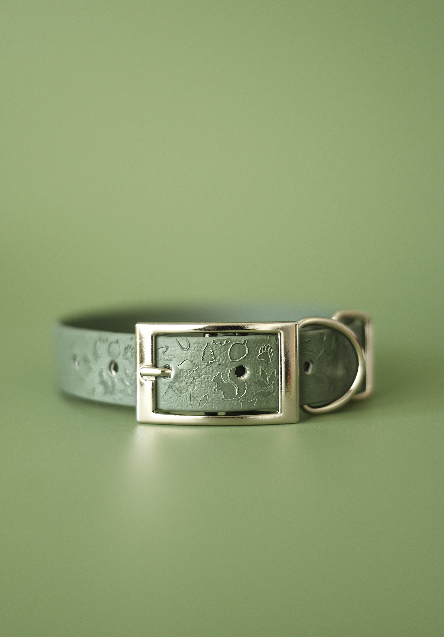 Forest Wanderers features a woodland theme, incorporating embossed Squirrels, Foliage, Mushrooms, Acorns, Trees, Bear Claws and Hummingbirds. It is crafted from our Moss Biothane.