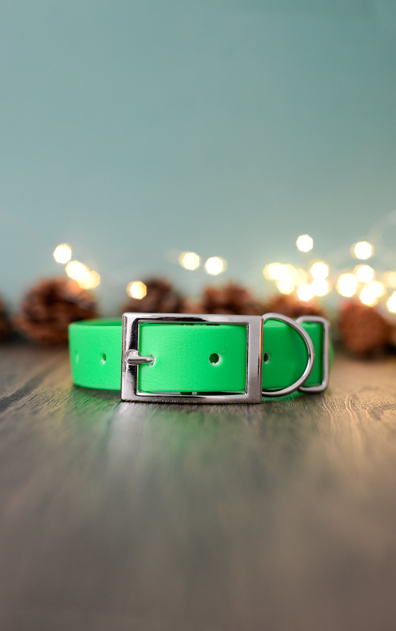 Made from authentic Biothane, our daring Neon Green dog collar is:
