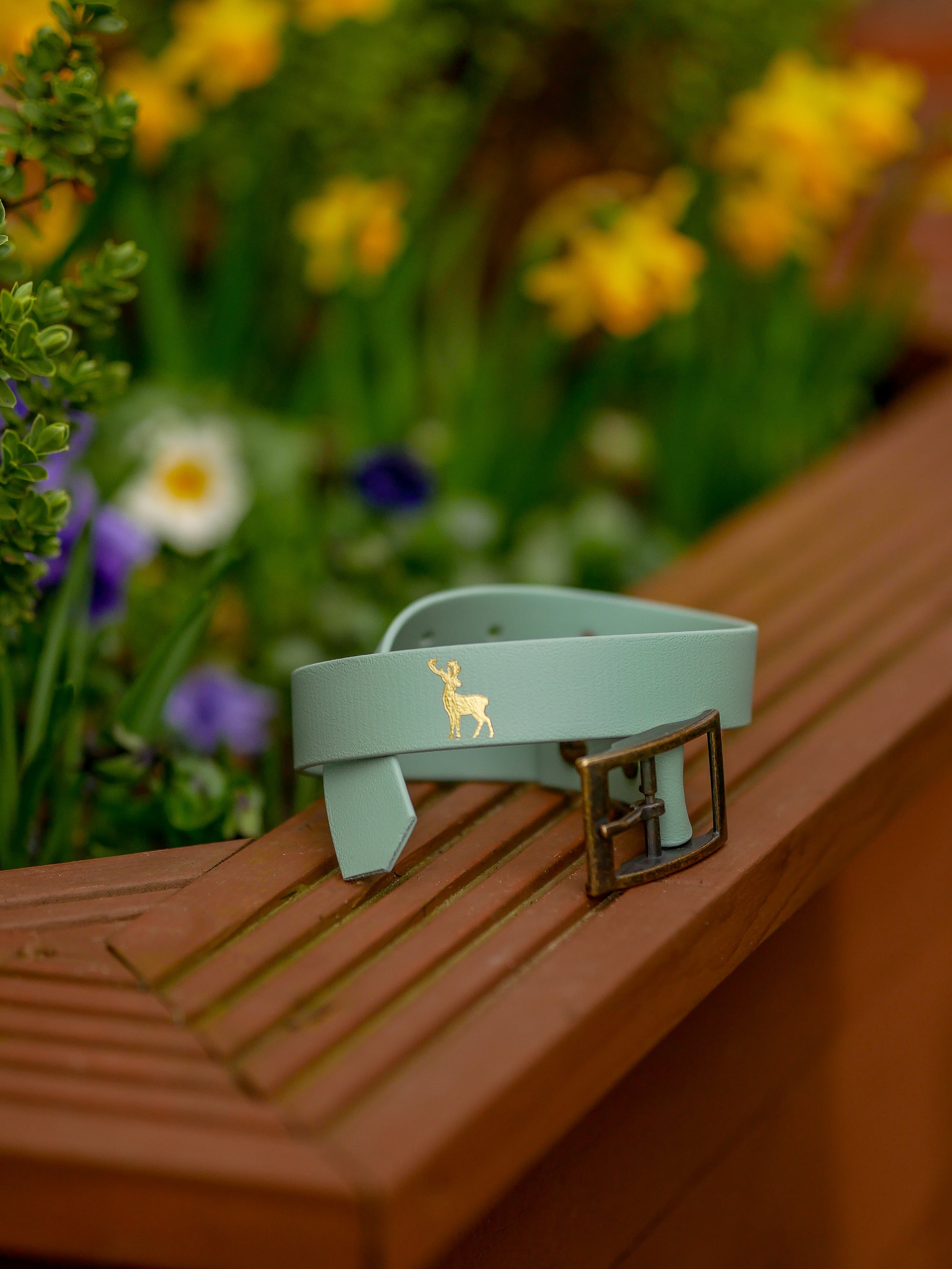 Our Noble collar features a beautiful golden foil embossed stag onto our Sage Biothane.