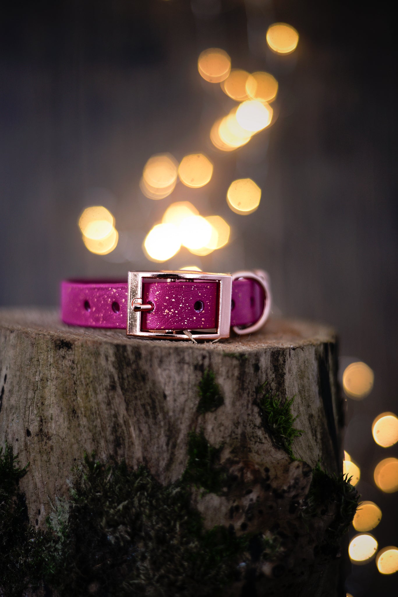 Our beautiful and elegant "Opulence" Biothane Dog Collar boasts a regal magenta color, paired with exquisite handpainted stars in your preference of rose gold, gold, or silver.