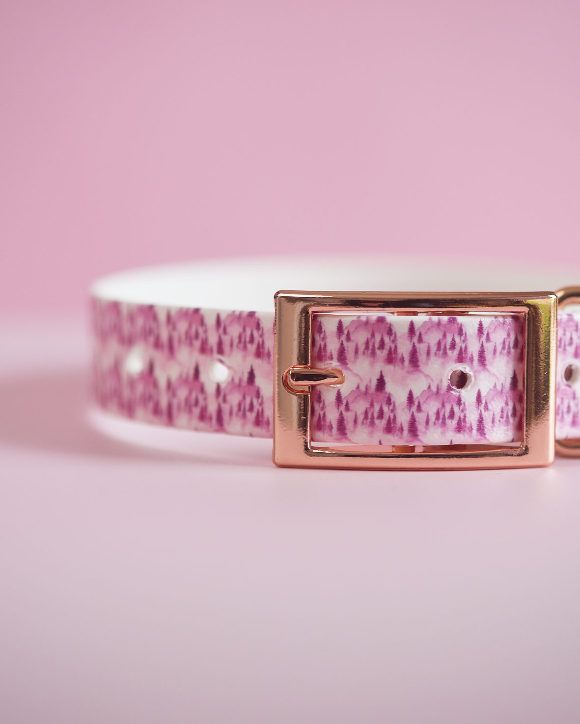 Our gorgeous Pink Pines UV Printed collar features beautiful pink trees and moorland on our Snow Biothane.