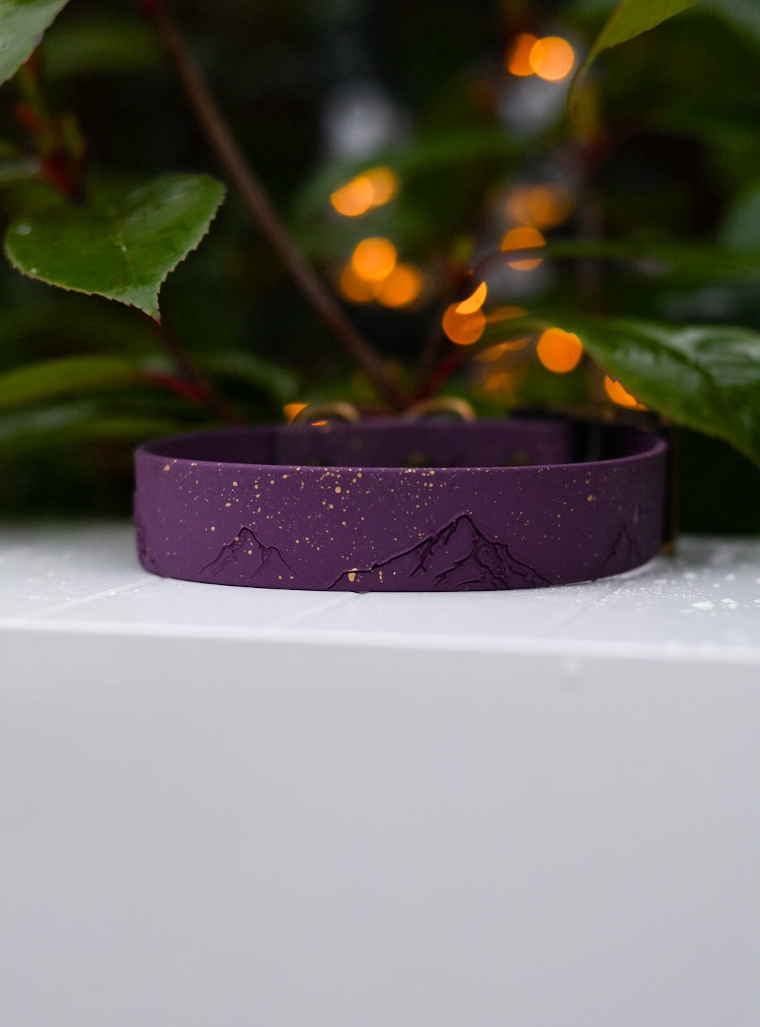 Starlit Mountains is adored with a stunning mountain pattern underneath handpainted gold stars and is crafted from our Elderberry Biothane.