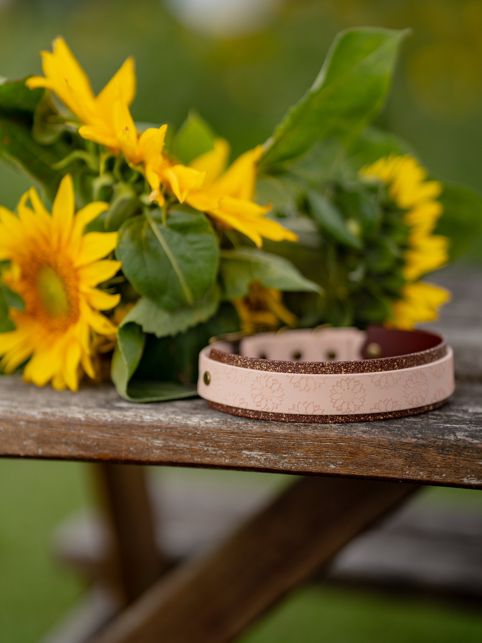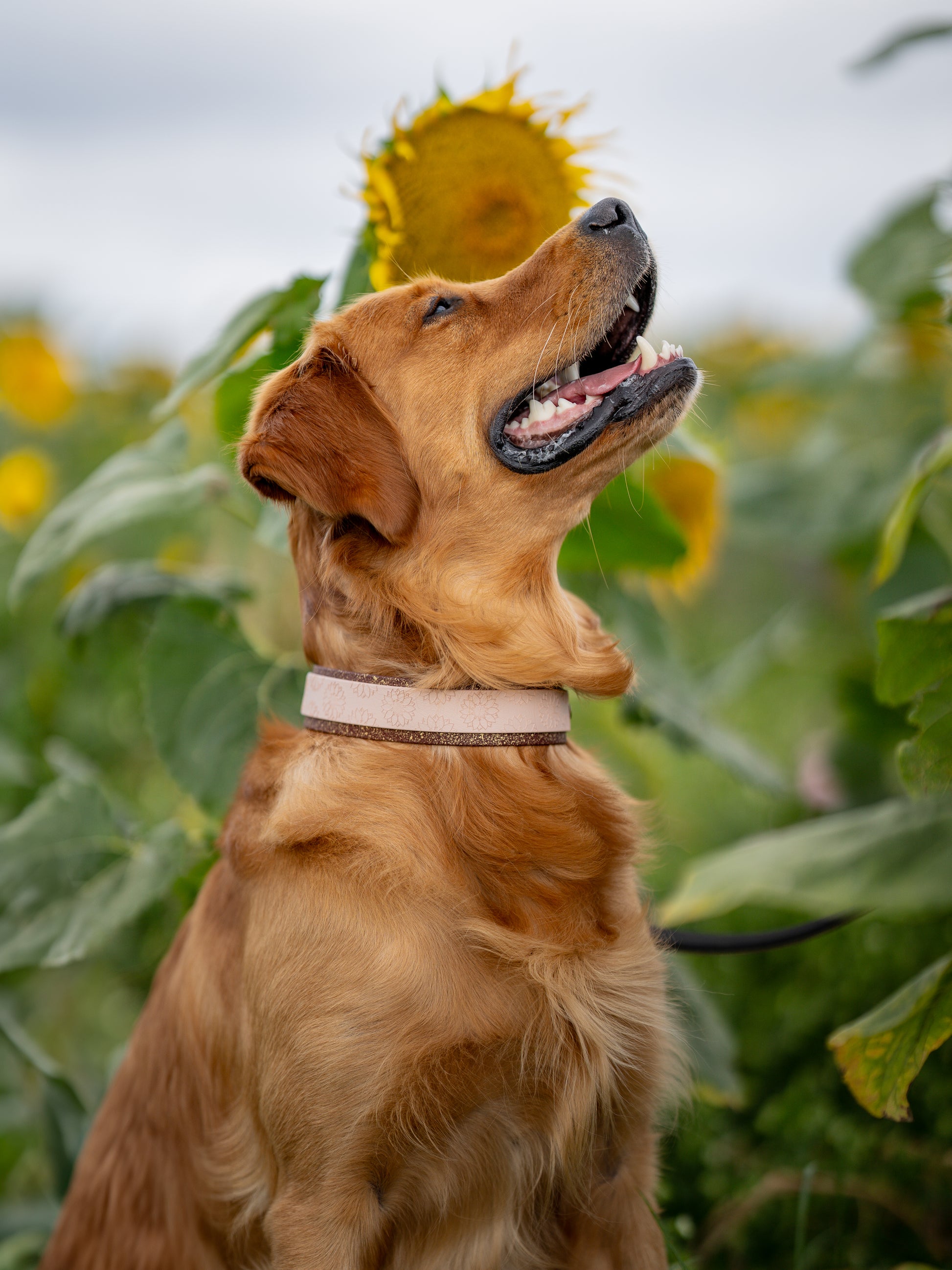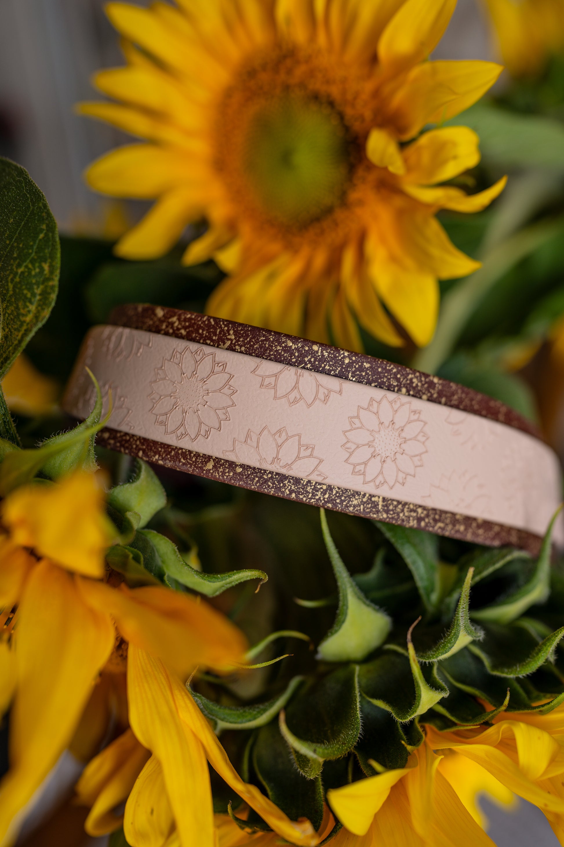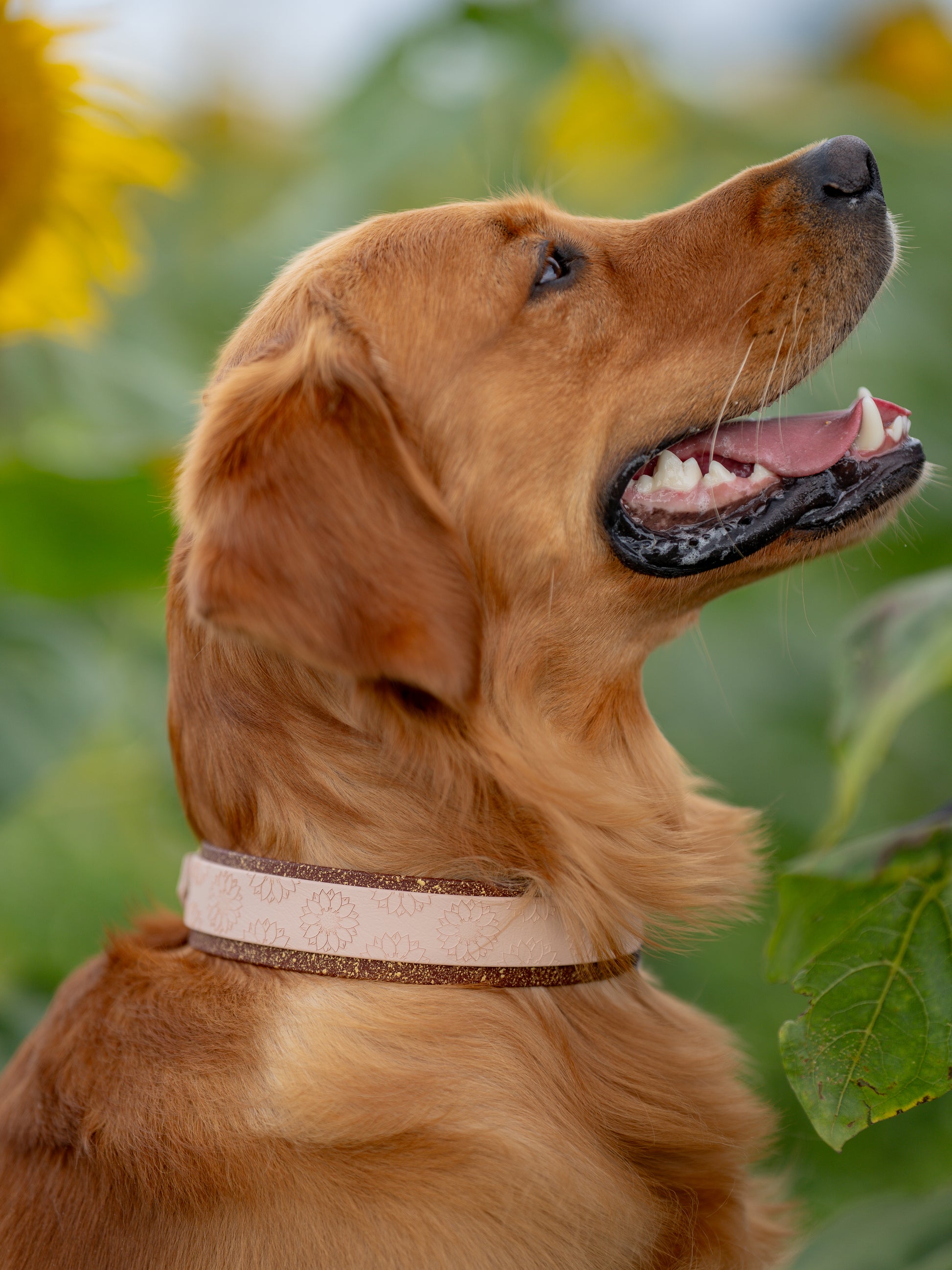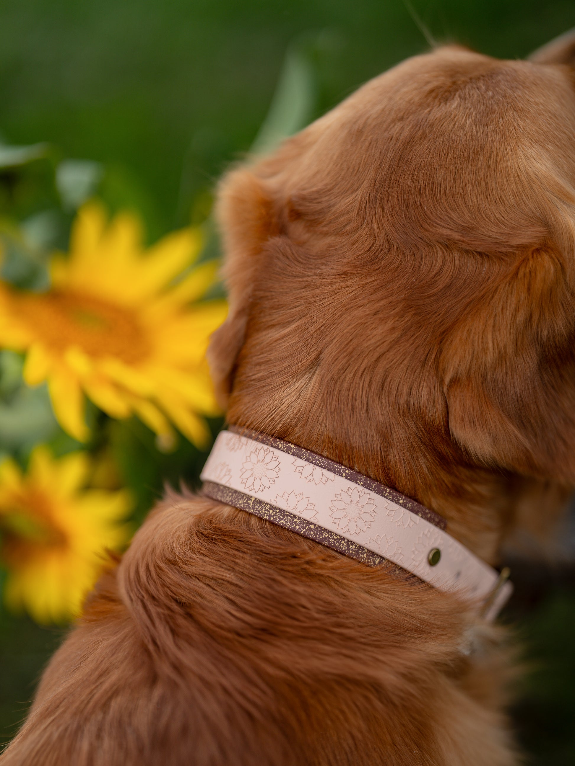 Sunflower Meadow is adorned with a beautiful sunflowers pattern and is crafted from our "Champagne" Biothane wraparound with our "Traditional" Biothane hound backing which has been handpainted with gold speckled stars.