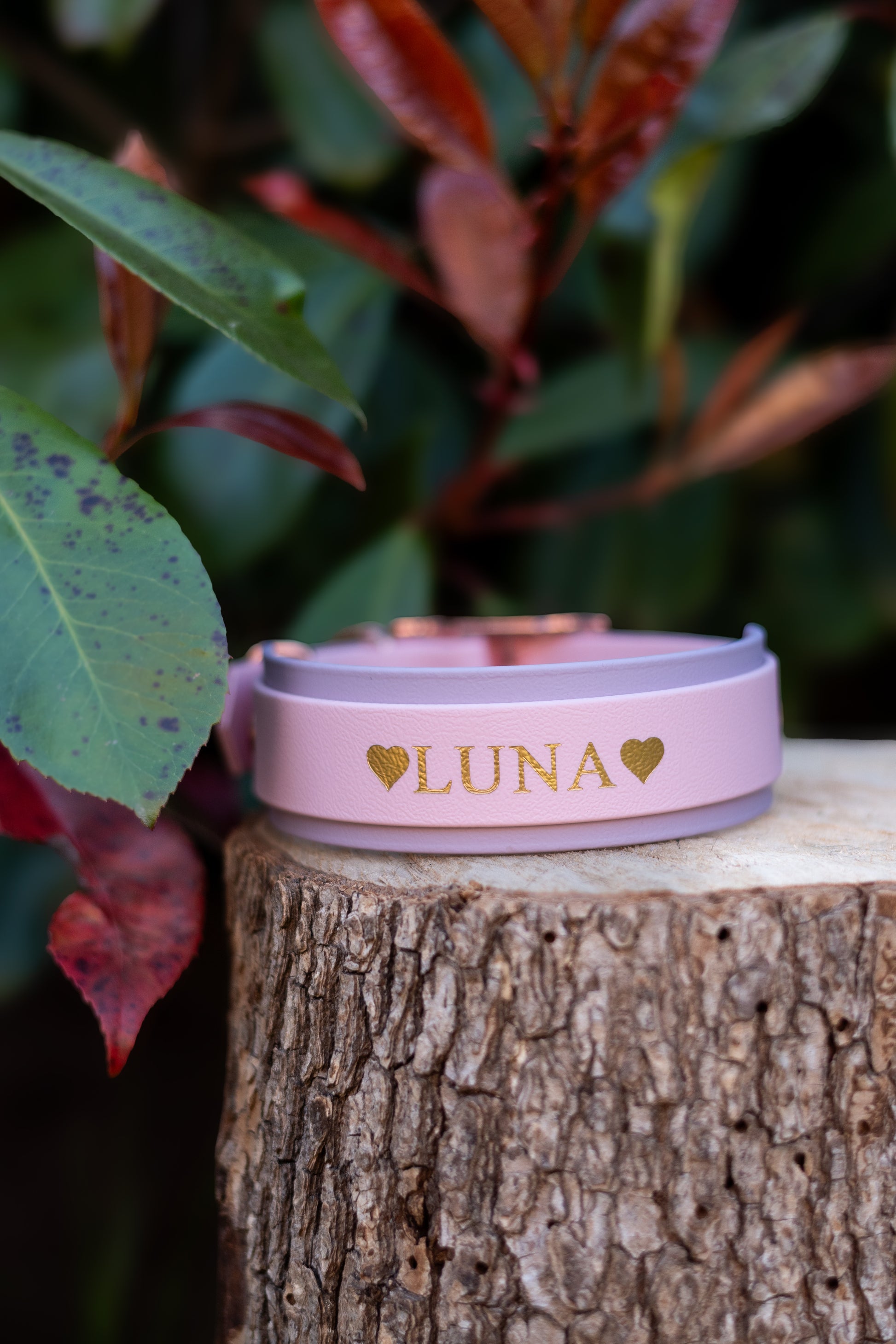 Featuring stunning matte gold foil embossed name details enclosed by hearts on a Pixie Biothane wraparound with a Lilac Backing. Sweet Pea is a classic, elegant addition to any dogs wardrobe.