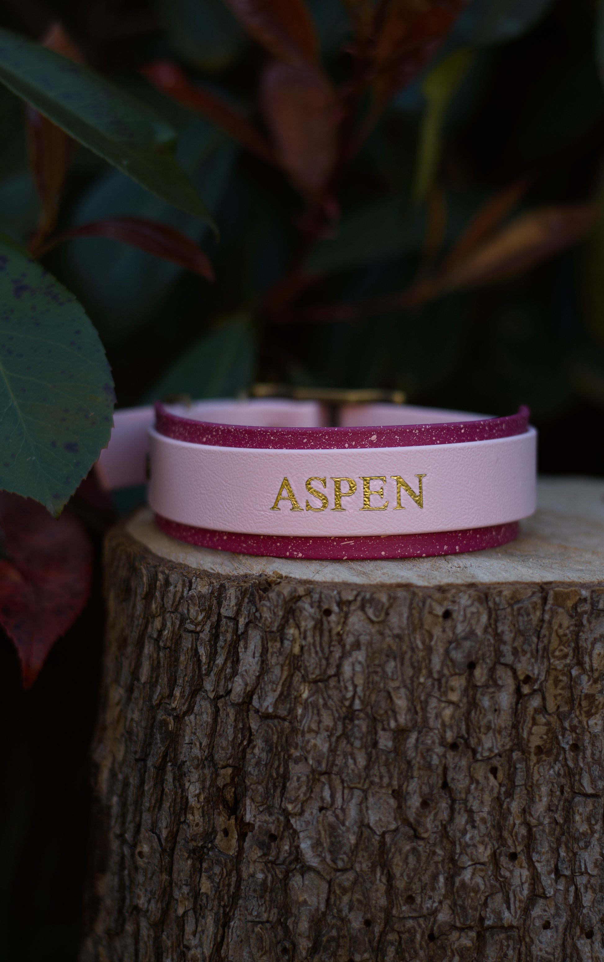 Inspired by one of our incredible ambassadogs, and featuring stunning matt gold embossed name details on a Pixie Biothane wraparound with a Pixie SS Magenta Backing. The Aspen is a classic, elegant addition to any dogs wardrobe.