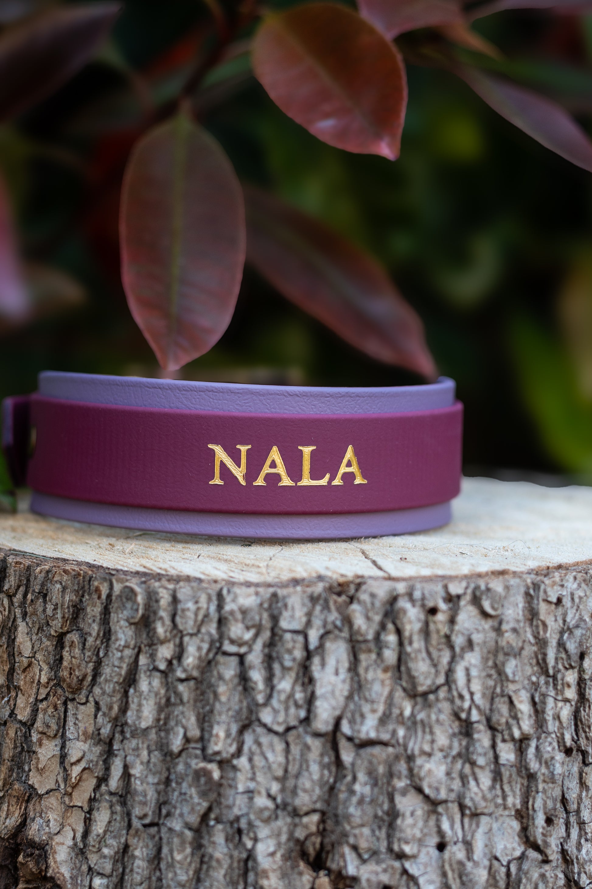 Inspired by one of our incredible ambassadogs and featuring stunning matte gold foil embossed name details on a Merlot Biothane wraparound with a Mauve Backing. The Nala is a classic, elegant addition to any dogs wardrobe.