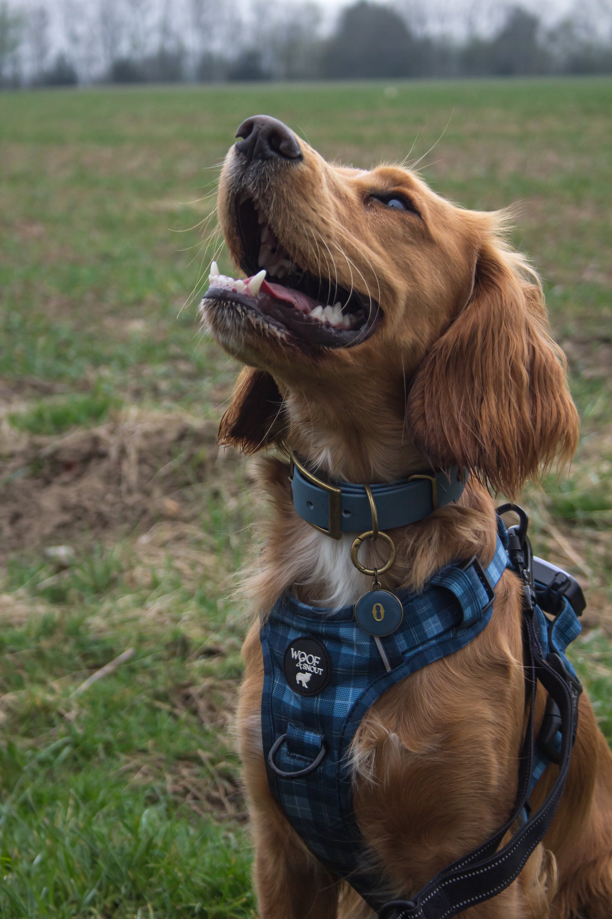 Inspired by one of our incredible ambassadogs, and featuring stunning matt gold embossed name details on a Blue Slate Biothane wraparound with a Gold SS Cosmos Backing. The Oakley is a classic, elegant addition to any dogs wardrobe.