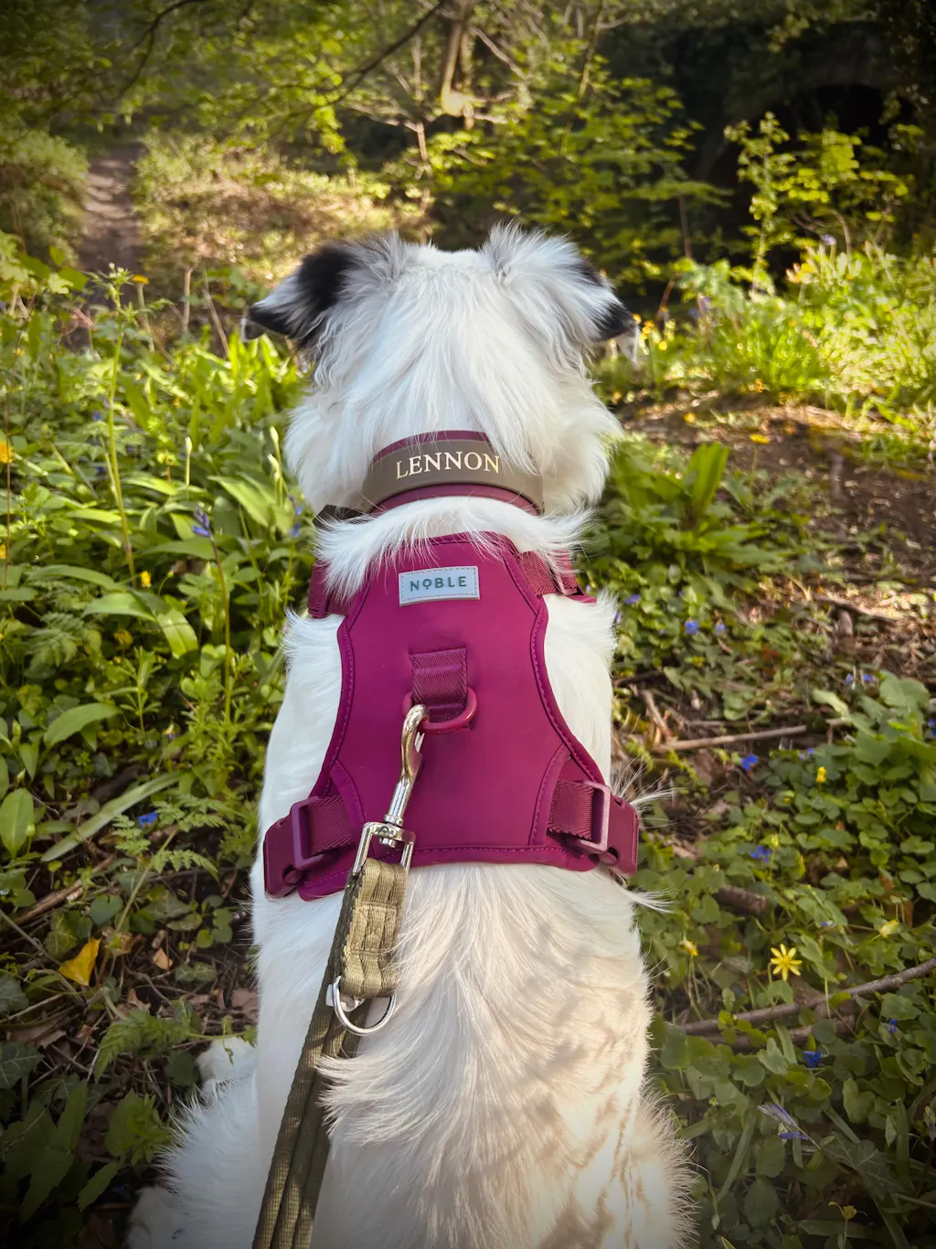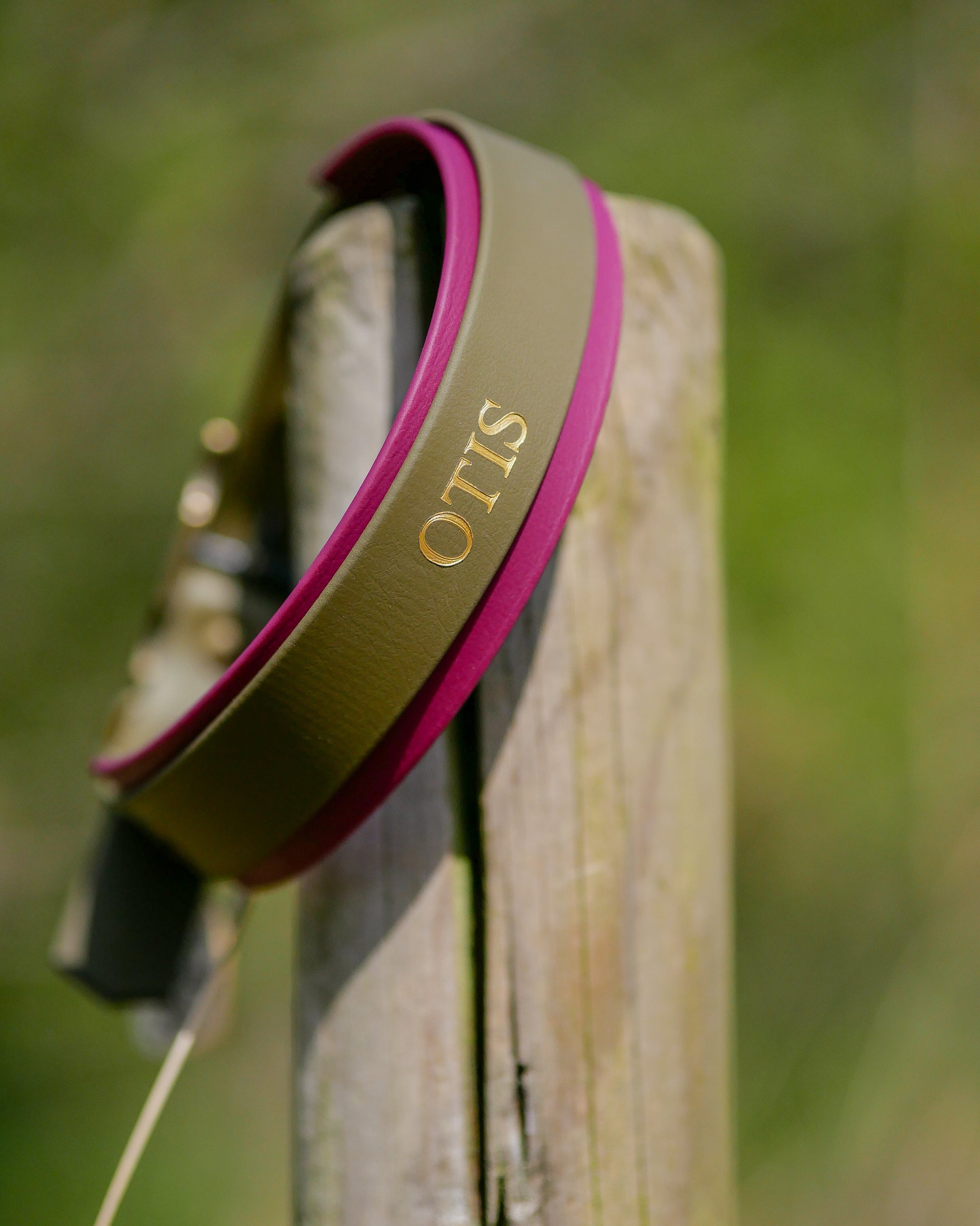 Inspired by one of our incredible ambassadogs, and featuring stunning matt gold embossed name details on an Olive Green Biothane wraparound with a Merlot Backing. The Otis is a classic, elegant addition to any dogs wardrobe.