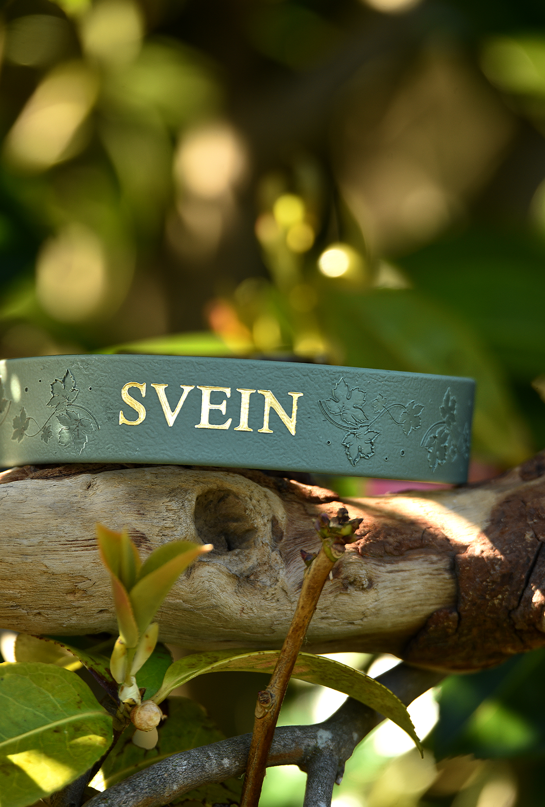 Vine and Dandy is adorned with a beautiful vine pattern surrounding your dogs name and is crafted from our Moss Biothane.