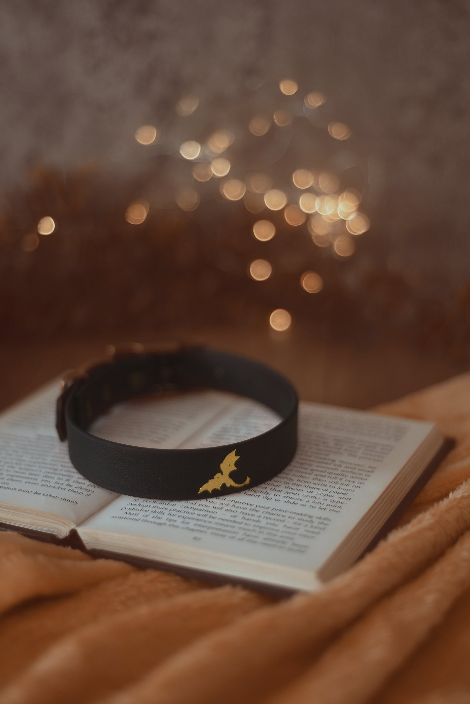Our Winged Flight dog collar features a golden embossed dragon soaring into the air on our Eclipse Biothane.