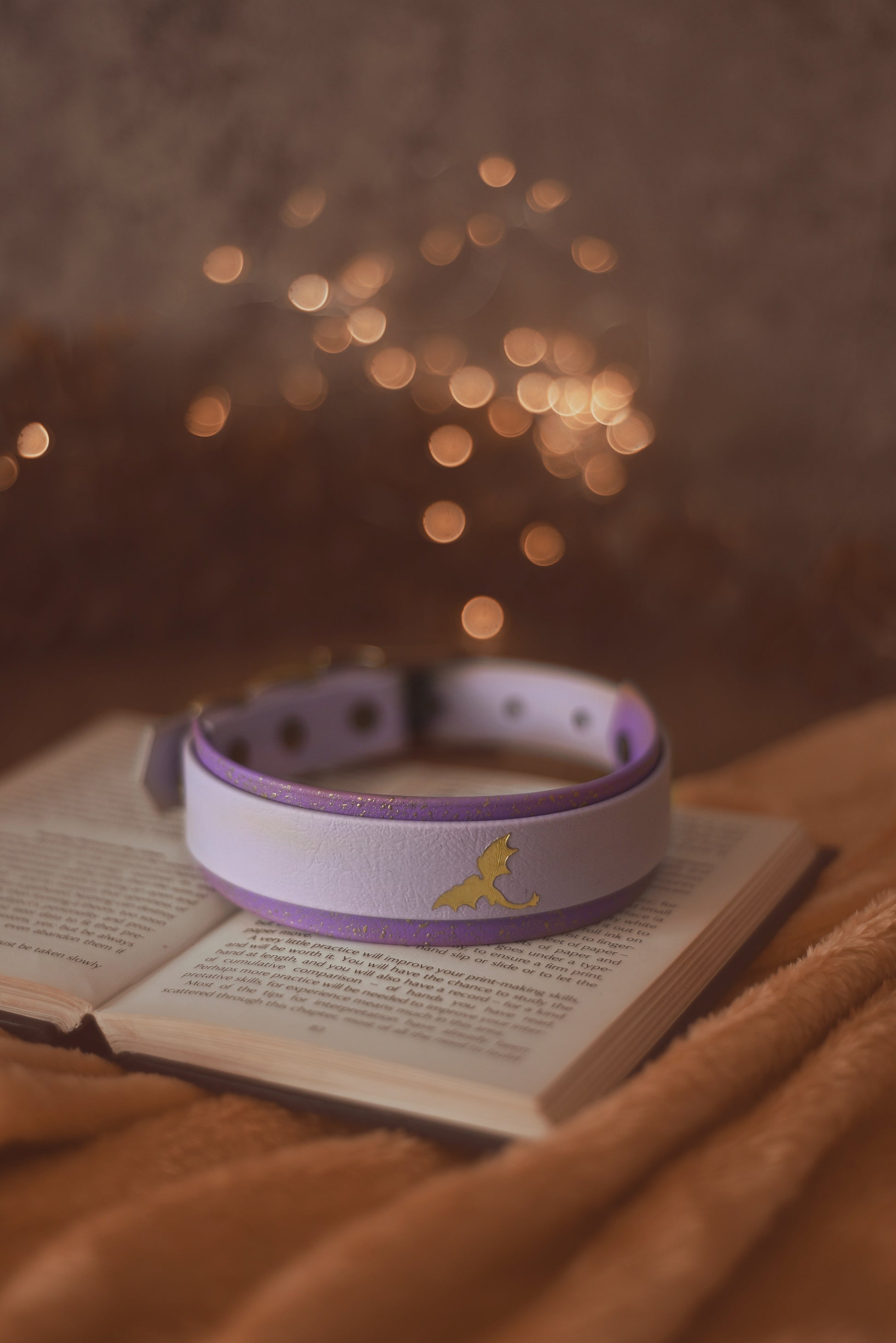 Our Winged Flight dog collar features a golden embossed dragon soaring into the air on our Lilac Biothane with an Amethyst hound backing adorned with golden handpainted speckled stars.