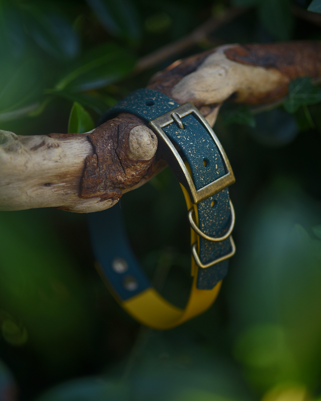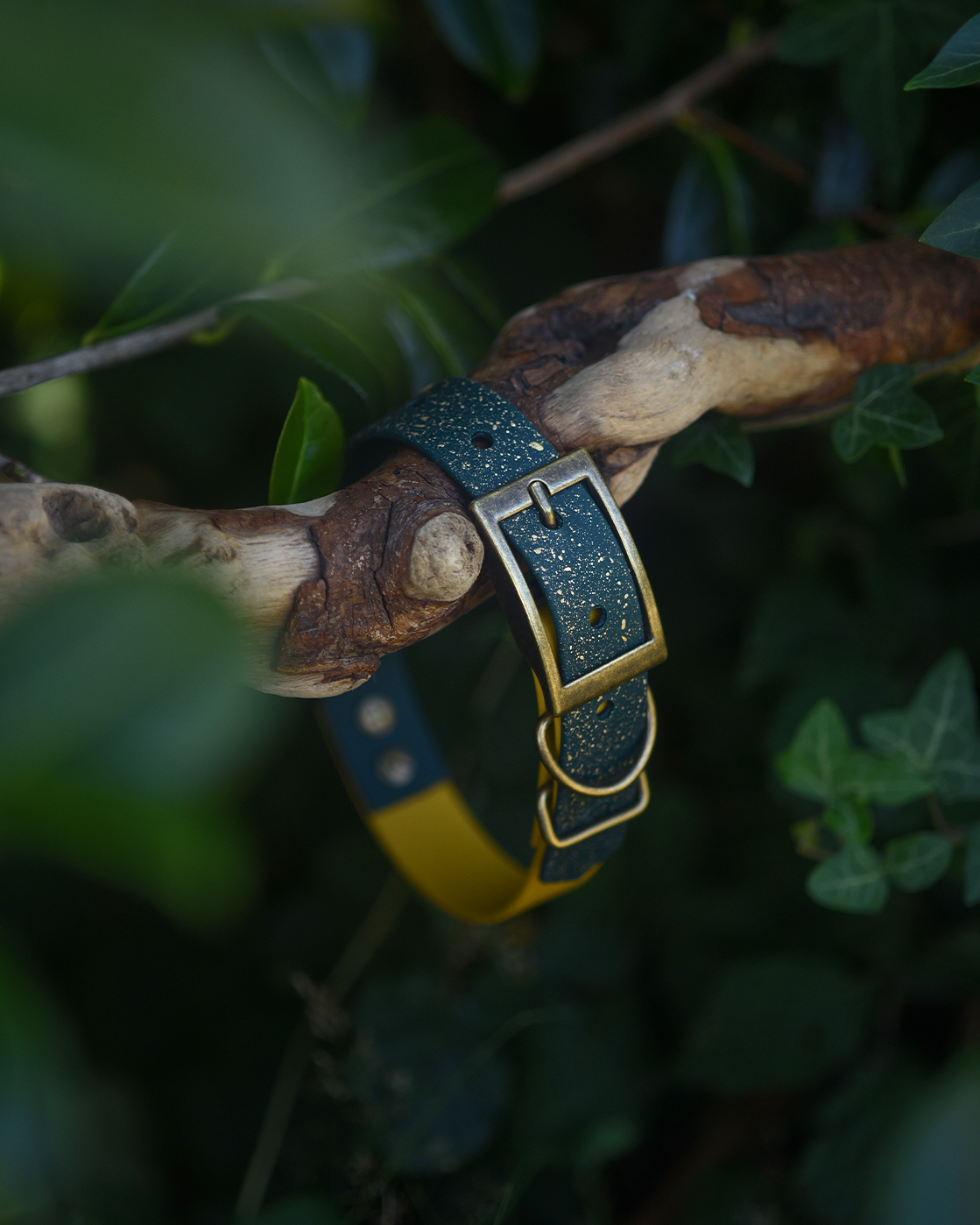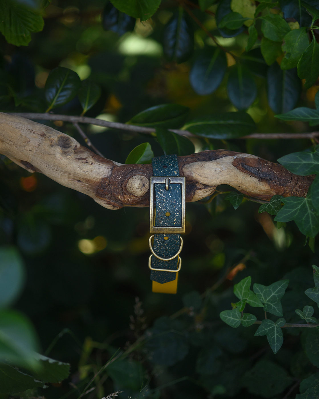The ‘Woodland Verse’ Sugar and Spice Explorer Collar is a two-tone arrow dog collar from our Storybook Collection, featuring Honeycomb Biothane on one side and Forest Biothane on the other. The Forest portion of the collar is handpainted with metallic gold speckled stars to tie both sides together. It is a remarkable, showstopping piece to add to your dogs collection.